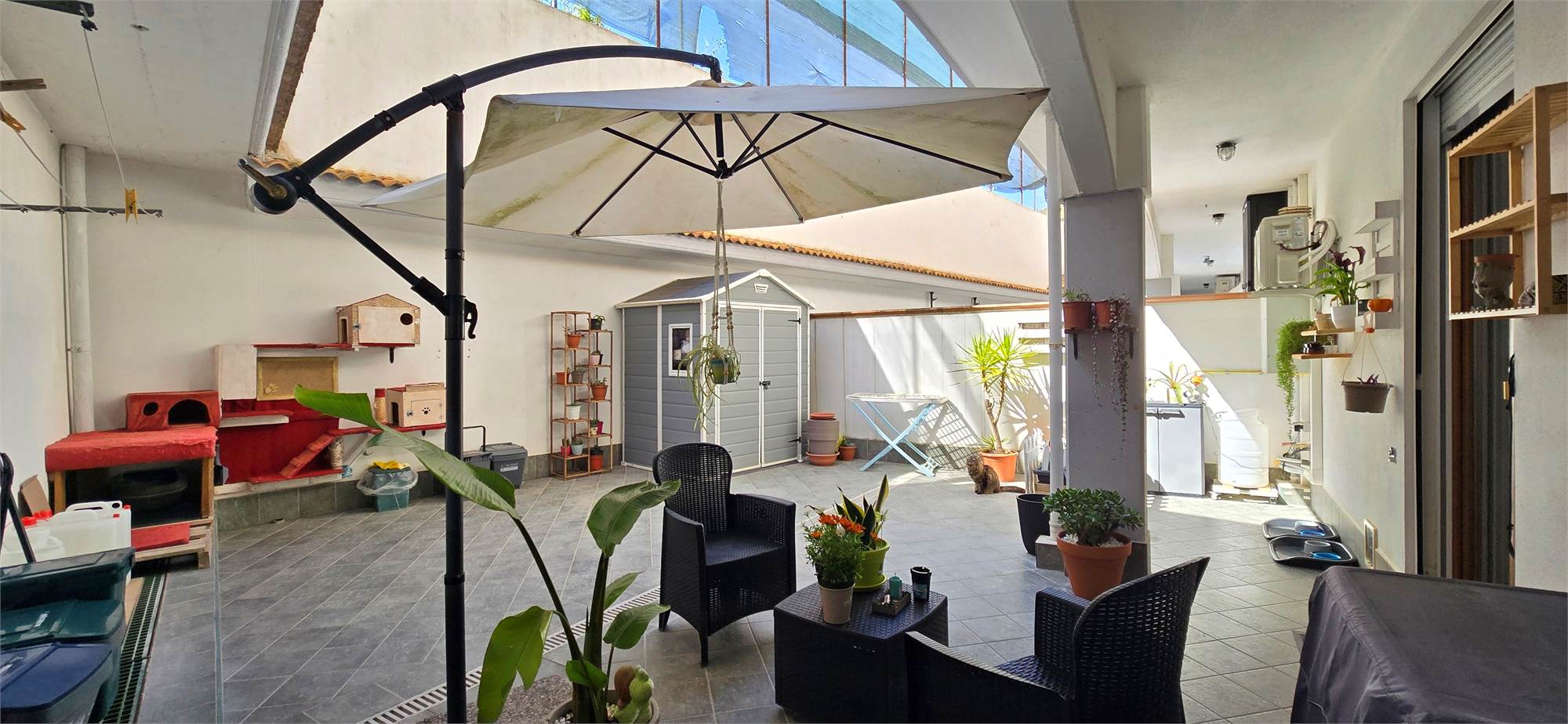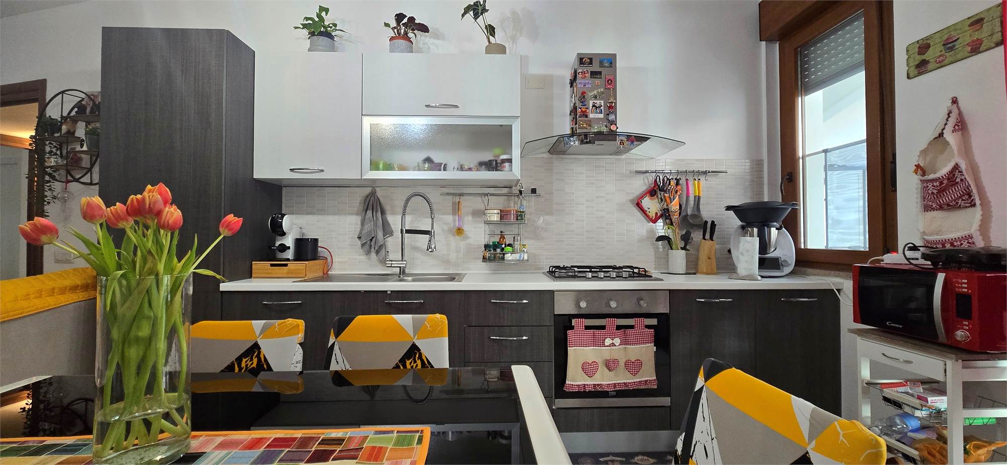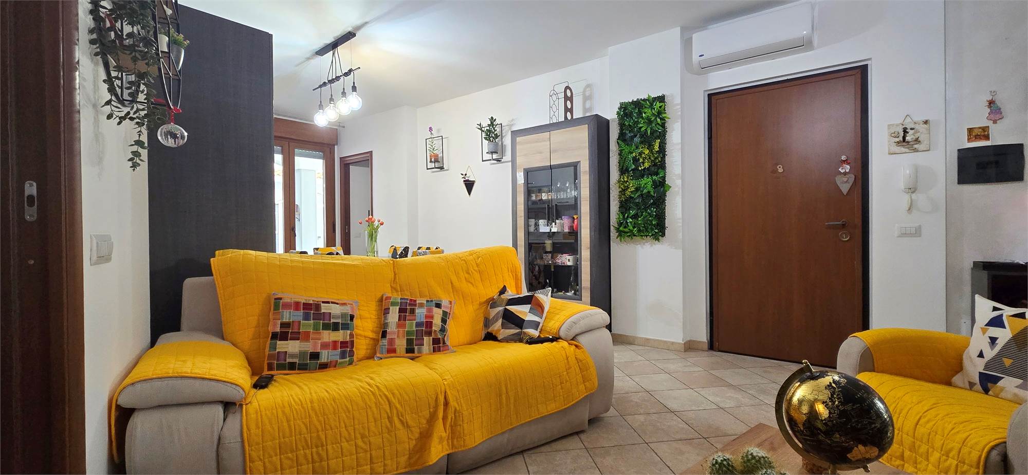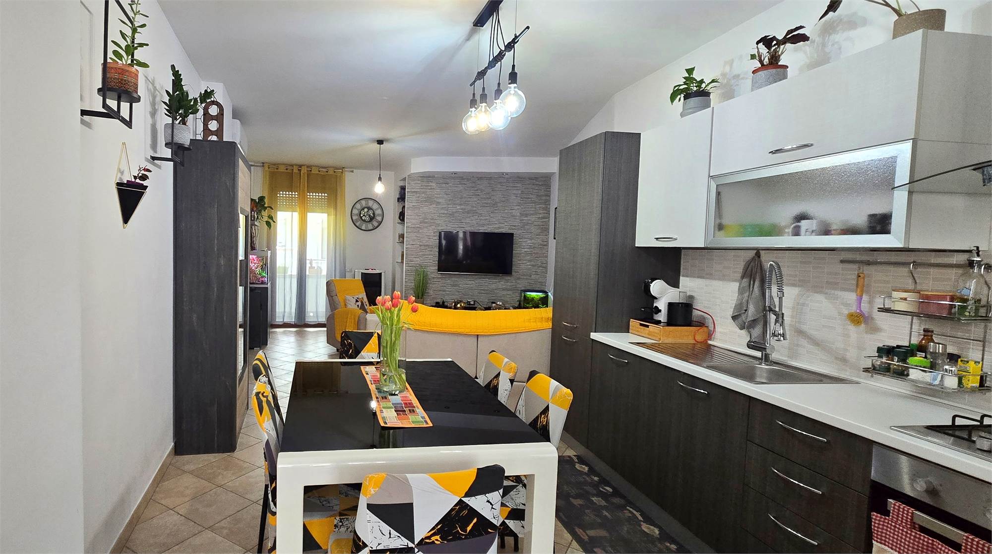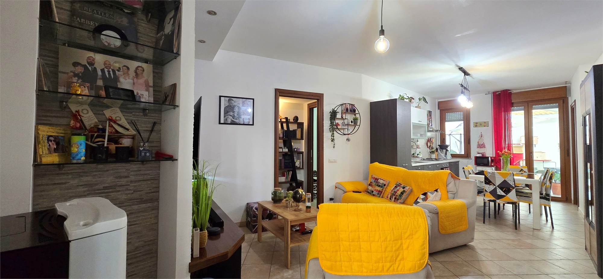 L’ingresso, tramite portoncino blindato, apre direttamente su una zona giorno open space accogliente e ben distribuita, con cucina a vista e accesso diretto al cortile privato di circa 45 m², ideale per cene all’aperto, momenti di relax e vita esterna in totale riservatezza. Entrando si percepiscono subito gli ambienti molto curati, una zona living moderna con dettagli di carattere, una cucina ben organizzata, bagno in ottimo stato e un’impostazione generale che rende l’immobile immediatamente gradevole e pronto da abitare.