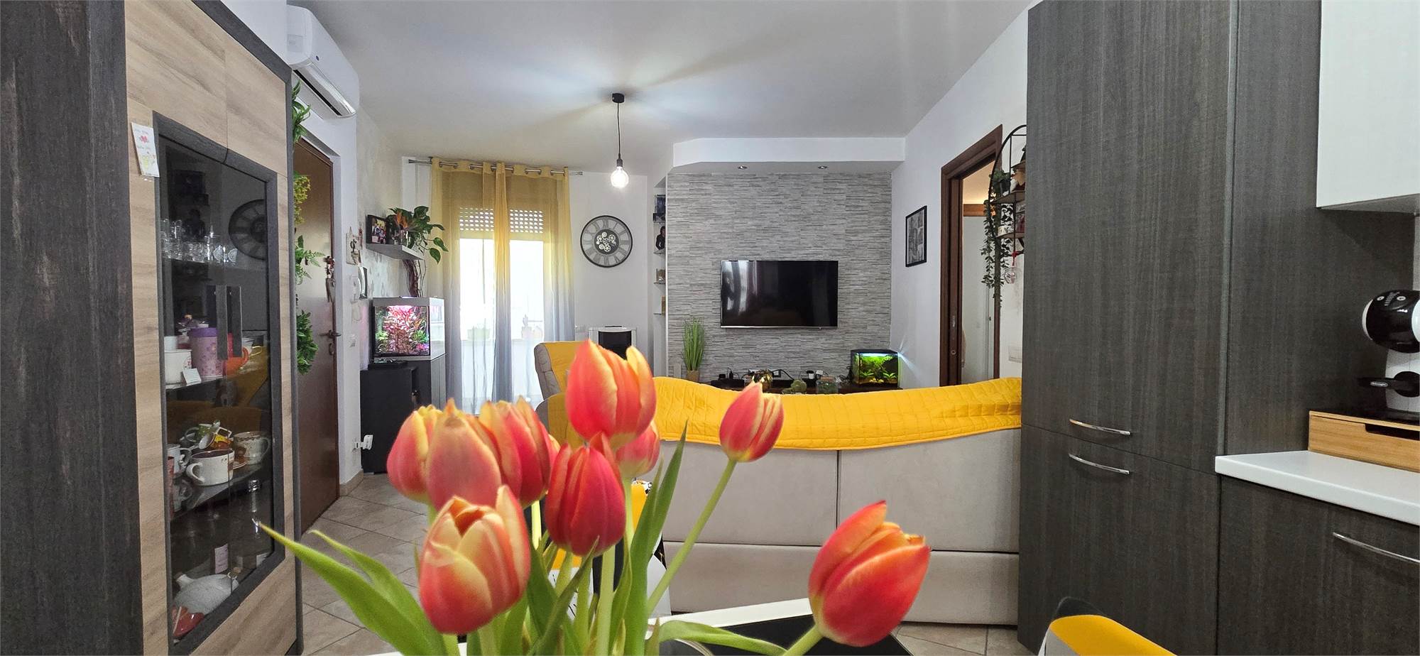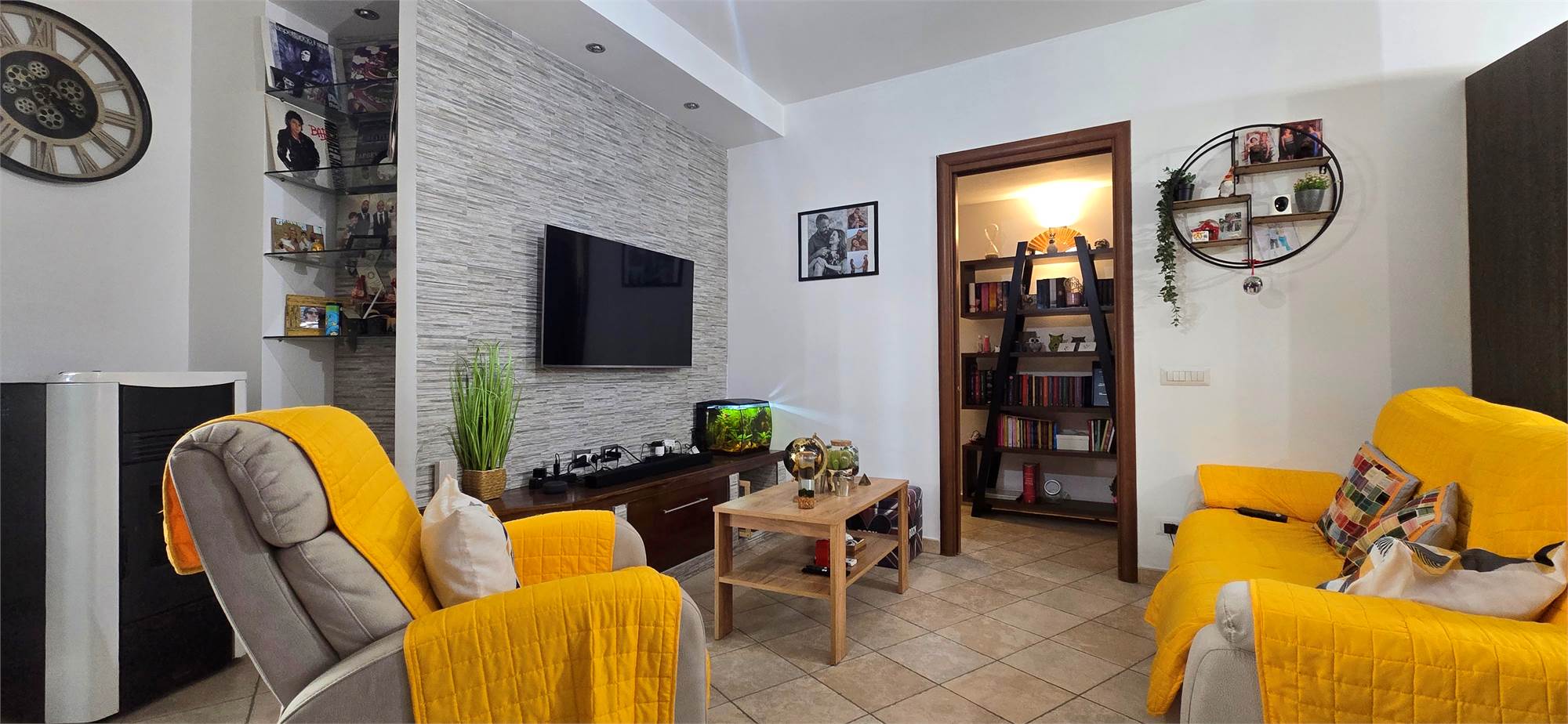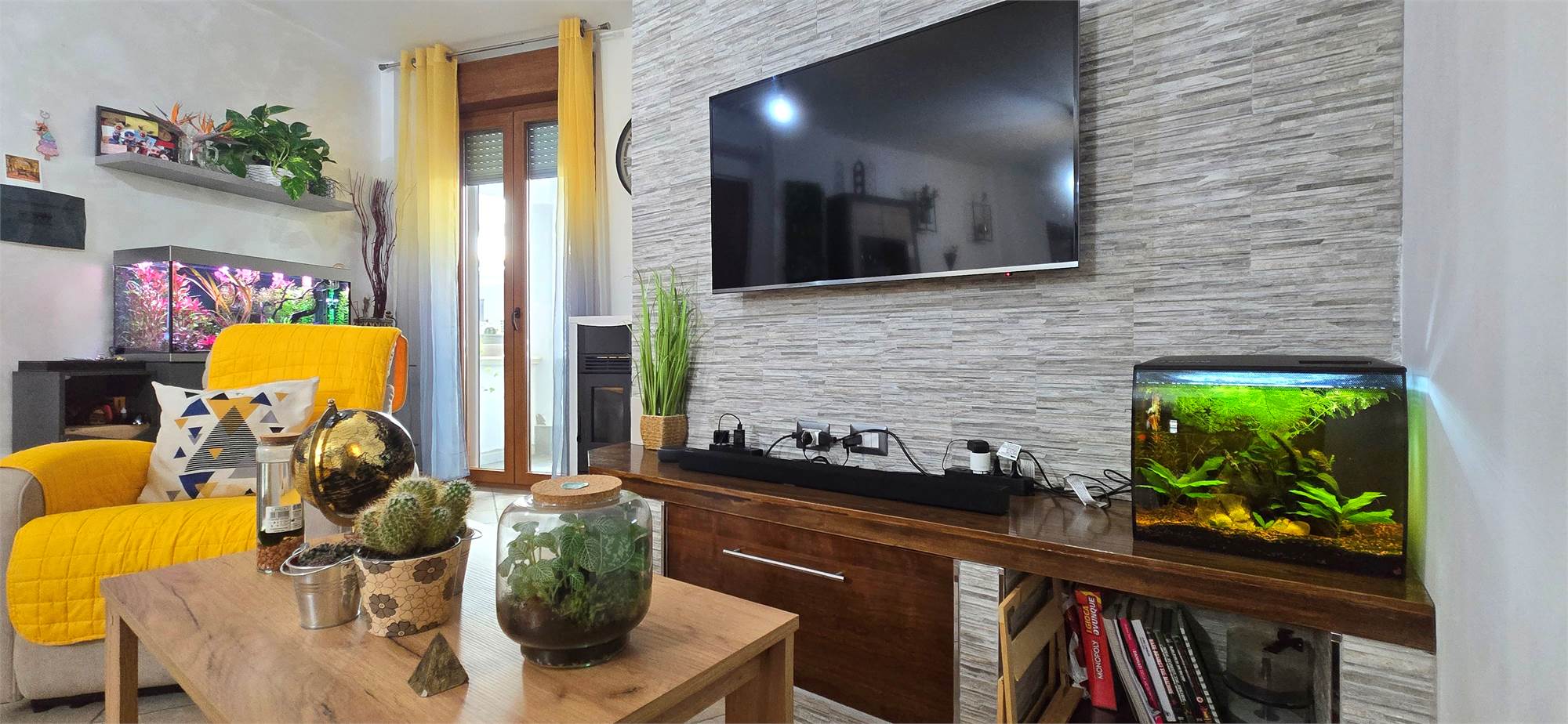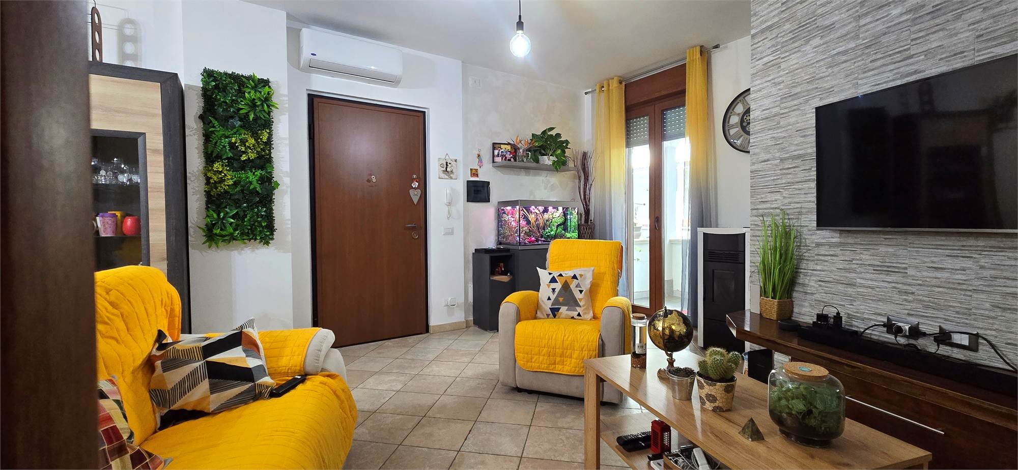 Completano il profilo dell’appartamento gli infissi in PVC con vetro camera a basso emissivo, il riscaldamento autonomo con stufa a pellet e le pompe di calore presenti in tutti gli ambienti, che conferiscono all’appartamento la classe energetica “C”, un plus molto apprezzato da chi valuta soluzioni di finanziamento green. Alcuni dettagli, come le pareti effetto pietra nella zona living, aggiungono personalità e un tocco di design.
